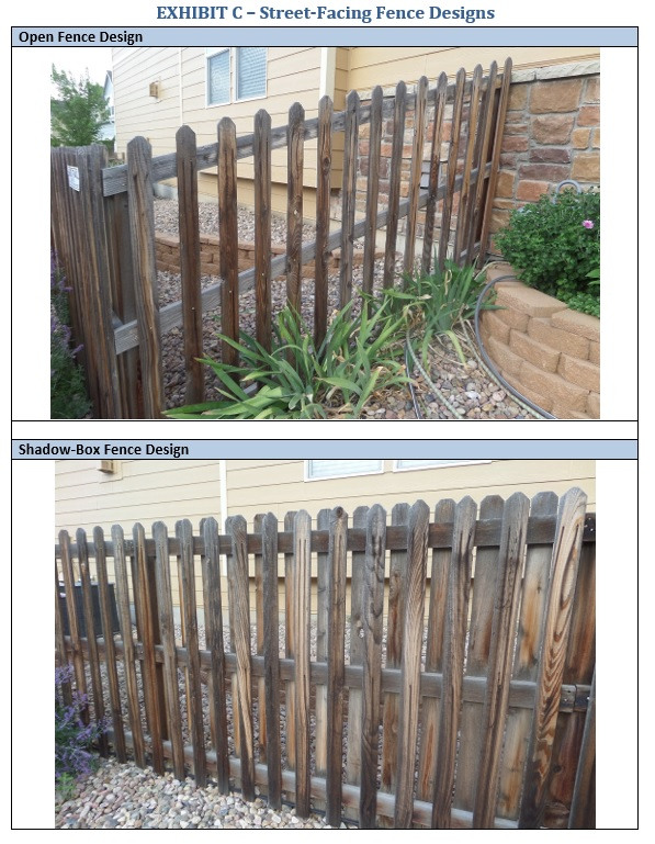 2.36.4.6. Material and Color: All perimeter fencing shall be constructed of wood. Vinyl, composite, stone or brick perimeter fencing is prohibited. Owners are not required to stain their fences. However, once fences are stained, Owners must maintain the fence stain color in good condition (free from peeling and fading). Fences may not be painted. Approved fence stain colors are provided in Exhibit E. If the Owner wants to stain the fence using a color not listed in Exhibit E, Committee approval is required.