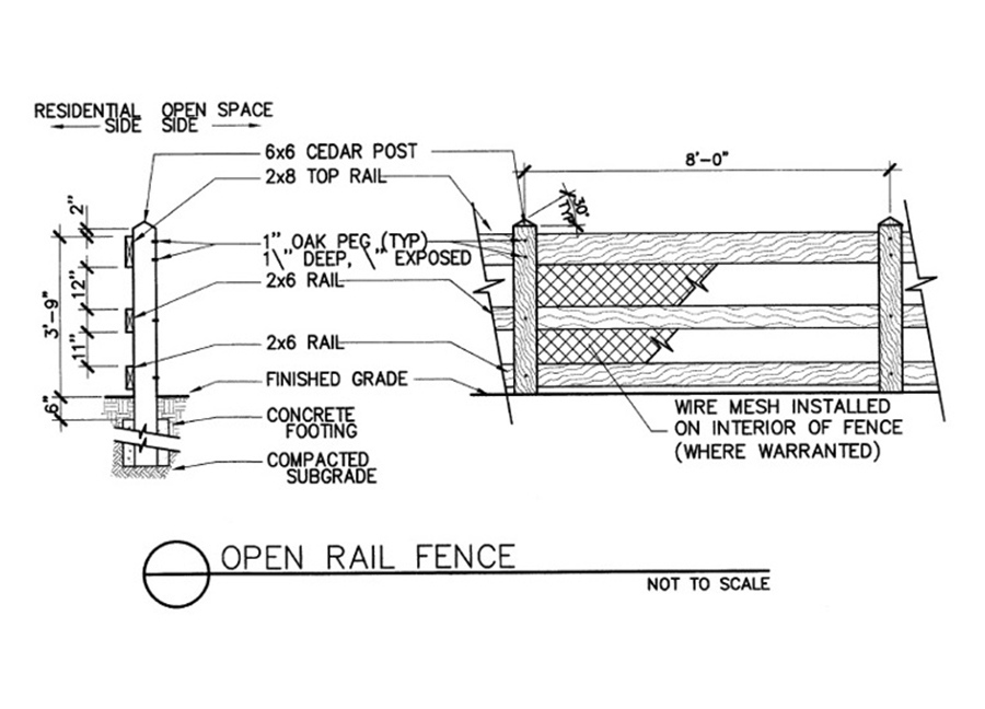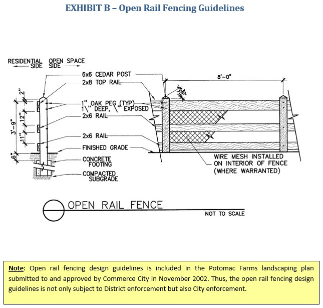 2.36.4.2. Open Rail Fences. All rear/side yard fences adjacent to Common Areas shall be installed on the property lines between the lot and the Common Area and shall be constructed in accordance with the design specifications provided in Exhibit B. Wire mesh may be installed on the interior (the side of the fence which closest to the Home) of an Open Rail Fence so long as such wire mesh is not higher than the top rail of said Fence. Open rail fencing shall be 3 feet in height.